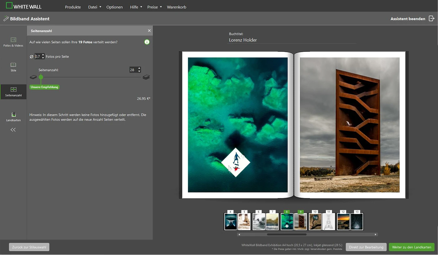 Anhand Ihrer ausgewählten Fotos oder Foto-Ordner erstellt unser Assistent direkt einen Vorschlag für das Layout Ihres Bildbandes – als Inspiration oder als ersten Entwurf. Jede Seite lässt sich danach wunschgerecht anpassen und weiterentwickeln. Gerade bei aufwendigen Reise-Bildbänden mit vielen Landschaftsbildern und Detailfotos ist der Bildband-Assistent eine effektive Hilfe.