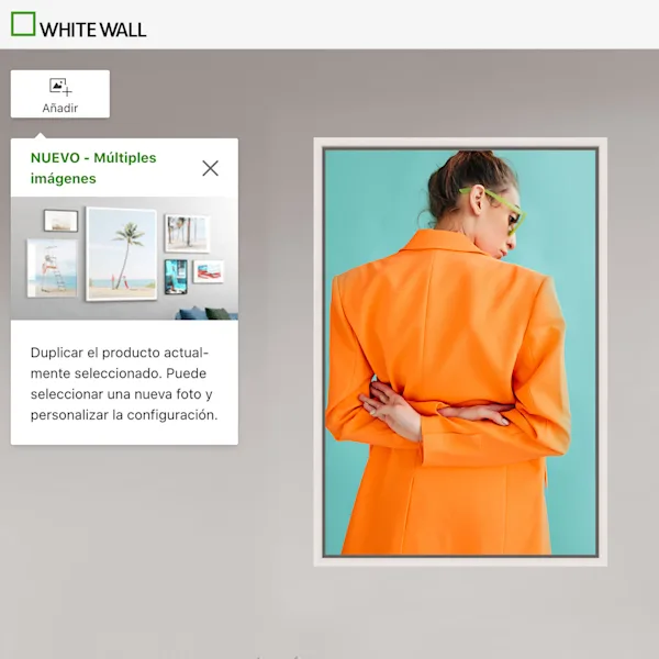 El configurador te permite configurar y visualizar simultáneamente varias variantes de tu cuadro mural. Así puedes componer fácilmente una composición para tu pared o comparar directamente distintos materiales, formatos u opciones de marco uno al lado del otro.
